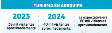 Todavía hay dificultades para el crecimiento del turismo en Arequipa. El expresidente de la Asociación de Agencias de Viajes y Turismo de Arequipa (Avit), Jorge Valderrama Salinas, señaló que el turismo durante el 484.° aniversario de Arequipa no superó las expectativas. Pese a que esperaban cerca de 60 mil turistas, solo llegaron 40 mil aproximadamente.