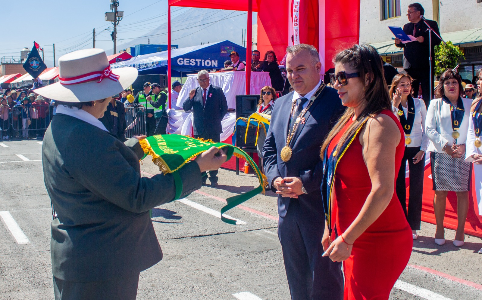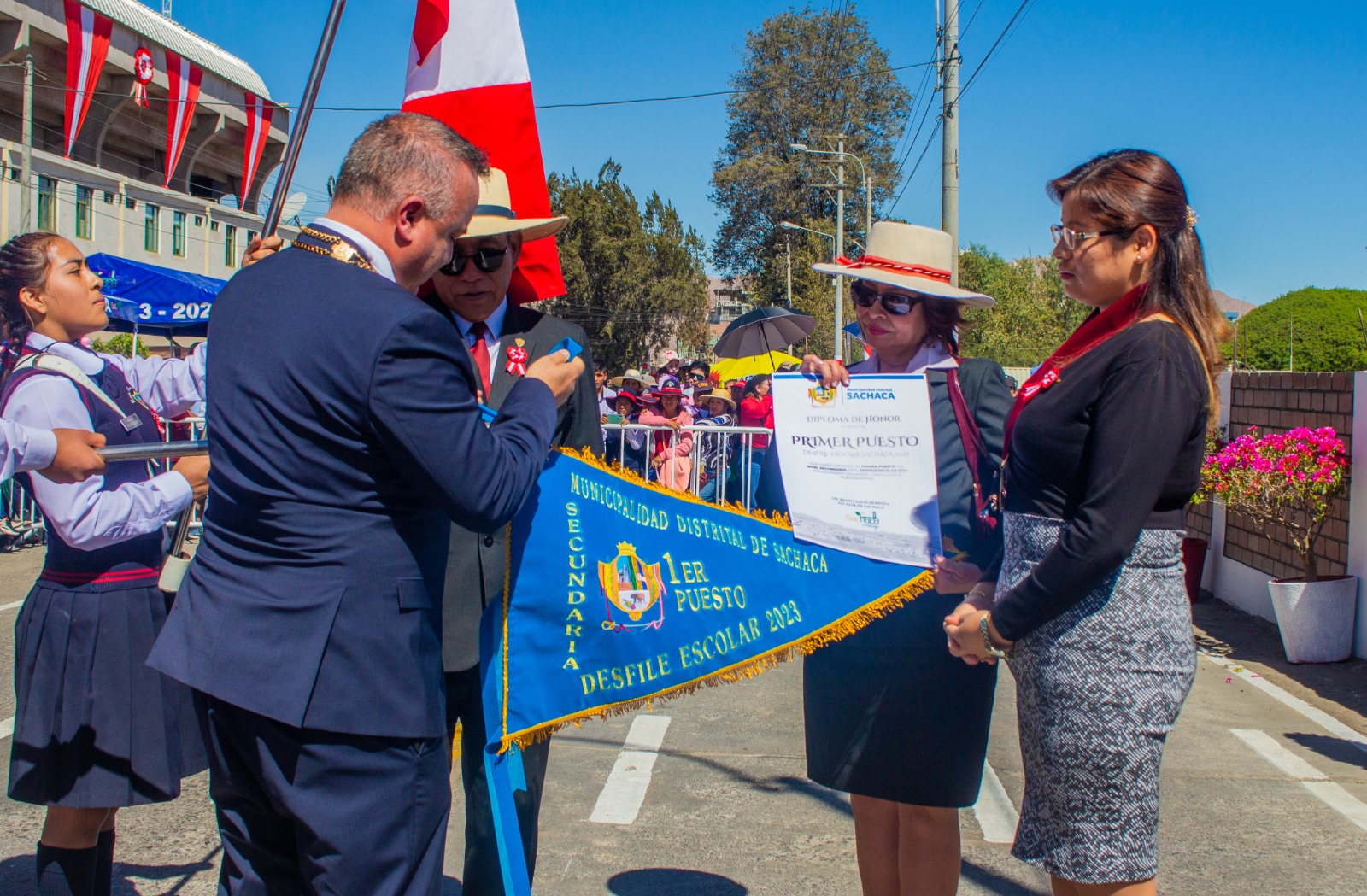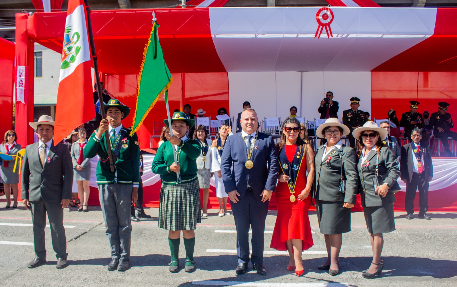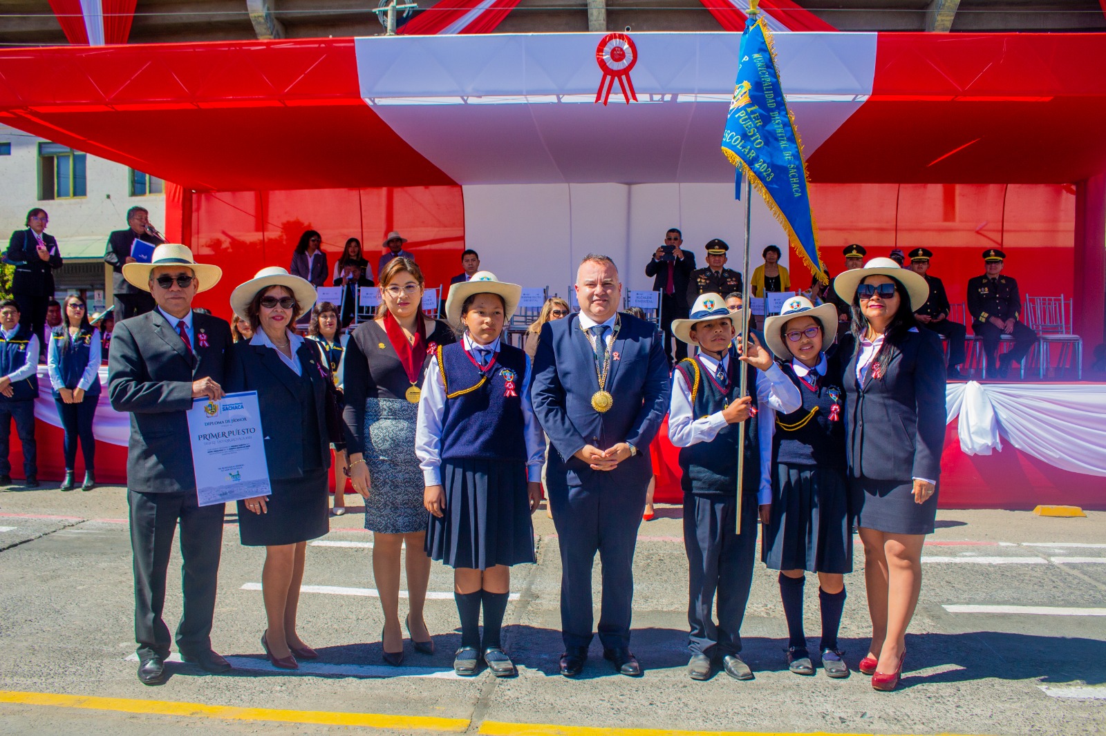 El alcalde distrital, Renzo Salas Herrera entregó el distintivo al plantel, que se caracterizó por la presentación de su delegación, presencia de escolta, paso de brigadieres; mostrando marcialidad y gallardía en su paso en la avenida Fernandini, que fue el escenario del desfile escolar que se realiza después de tres años, tiempo en el que se suspendieron las actividades de concentración de escolares por la covid-19.