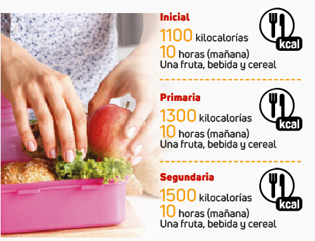 Al respecto, enfatizó que no se puede enviar una lochera rápida o altos contenidos de azúcar, sino debe tener una fruta (entera), bebida natural (agua hervida y jugo), cereales y carbohidratos (camote, papa y quinua). La porciones deben ser medidas de acuerdo al estómago del menor. Los refrigerios deben ser enviados no solo para el nivel inicial sino también para escolares de primaria y secundaria. Los niveles de calorías subirán de acuerdo al 15 % según el nivel.
