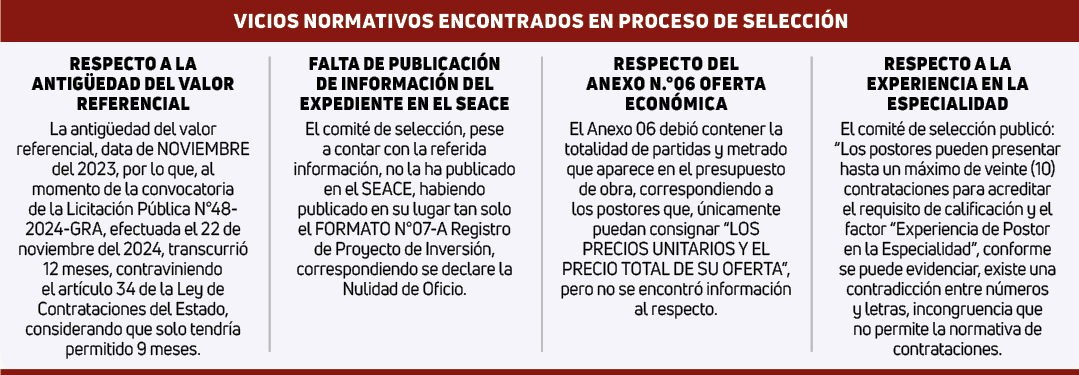 Una denuncia puesta por el ciudadano José Gómez Romero reveló cuatro transgresiones a la norma no percibidas por el comité de selección del Gobierno Regional de Arequipa (GRA) durante la licitación pública n.°48-2024-GRA-1 del proyecto “Mejoramiento vial en Jachaña, Tambopata, Viscavisca, Cayarani y puente Cayarani en Caylloma”.