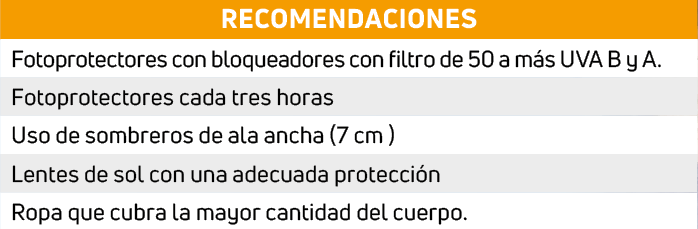 Este año incrementó en 30 % las afecciones a la piel. Los pacientes muestran lentigos solares (manchas benignas), melanoma es un lentigo maligno y queratosis actínica que son manchas con encamación. También lunares nuevos y otros que cambian de forma y pueden ser riesgosos.
