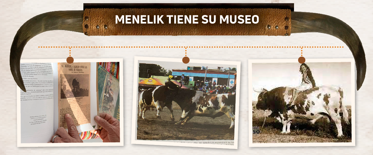 SU MUSEO. Si usted quiere conocer la historia de esta leyenda, visite el museo de Menelik, ubicado en Paucarpata en la av. Colón 180 donde el señor Juan Lorenzo Carpio Lazo con una sonrisa cálida y una mirada que guarda historias, te espera para guiarte a través del lugar que guarda las pruebas del toro recordado por los lugareños. Juan Carpio tiene en su memoria muchas vivencias y los espera en el museo para conocer a tan imponente Menelik.