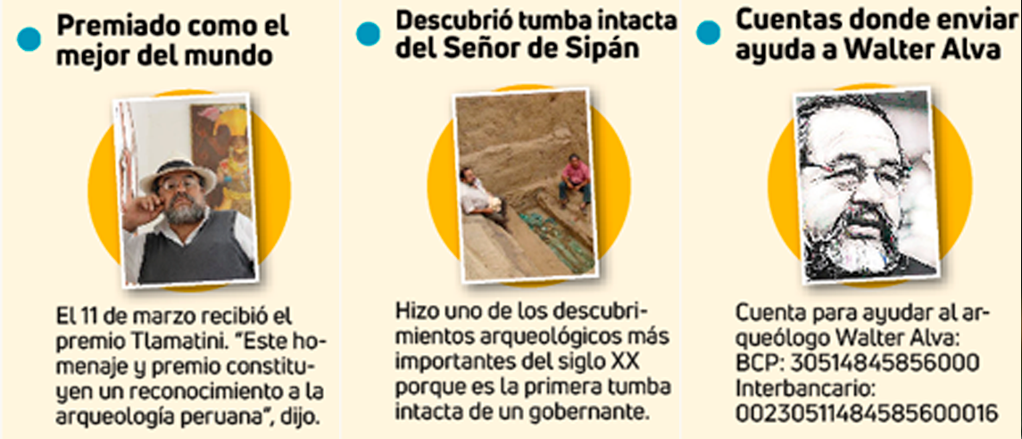 A inicios de mayo informaron que Walter Alva ingresó a la unidad de cuidados intensivos de una clínica estadounidense, luego que sufriera complicaciones en su salud en Estados Unidos a donde viajó para recibir el premio Tlamatini que por primera vez le dan a un peruano por su destacada labor, aporte y contribución al conocimiento de las culturas americanas y descubridor de la tumba intacta del Señor de Sipán.