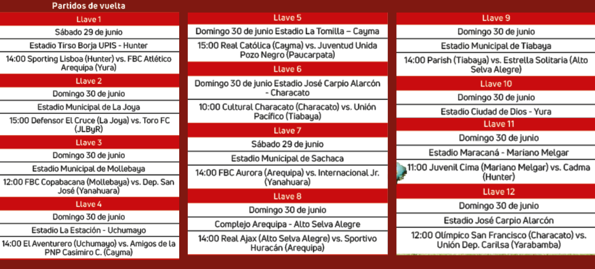El sábado 29 de junio se disputará dos encuentros, uno de ellos es el que afrontarán a las 14:00 horas, FBC Aurora frente a Internacional Junior (Yanahuara) en el estadio Municipal de Sachaca. A esa misma hora, pero en el estadio Tirso Borja en Hunter, Sporting Lisboa (Hunter) lidiará ante FBC Atlético Arequipa (Yura). Los otros diez partidos de vuelta de las respectivas llaves se completarán este domingo 30 de junio.