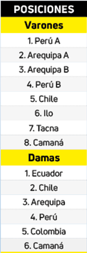 Por su parte, la escuadra de Arequipa B, que en la primera y segunda jornada de la ronda de grupos, batió 2-0 (9-3/17-6) a Camaná y 2-1 (9-14/14-13/4-2) a Chile, respectivamente, chapó el tercer lugar luego de batir en un choque definitorio 2-0 (16-6/10-6) a Perú B, afincado en el cuarto puesto.