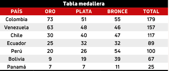 Los cafeteros se afincaron primeros con 179 metales, producto de sus 73 de oro, 51 de plata y 55 de bronce. Venezuela le siguió y después aparece Chile.
