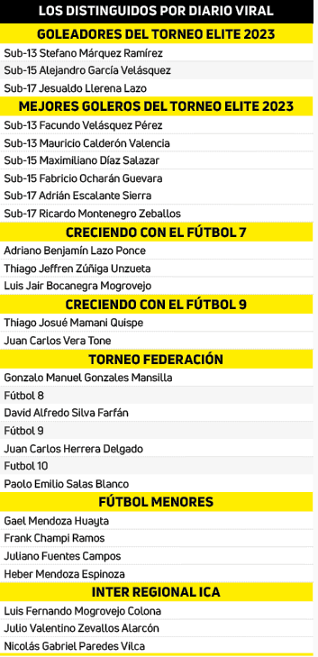 Por ello, Diario Viral, en coordinación con las entidades que manejan el fútbol de menores, logró reunir la mayor información de los menores que destacaron en sus diferentes equipos, los que fueron distinguidos en la ceremonia de reconocimiento a ‘Los mejores deportistas 2023’ en sus respectivas categorías y que organizó nuestra casa periodística el pasado 15 de marzo en las instalaciones del coliseo Arequipa en una reunión que superó las expectativas de los dirigentes y deportistas.