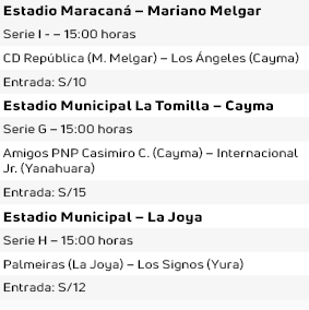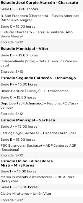 Para este domingo 27 de abril se tienen previsto realizar 19 partidos más en diferentes escenarios. El distrito de Mollebaya no podrá ver en acción a sus representantes, Deportivo Scorza y FC Copacabana, debido a que el escenario local sigue en refacción. Por ello jugarán en el estadio Melgar.