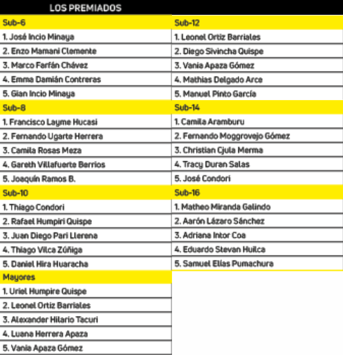 Los cinco primeros de cada categoría se hicieron acreedores a sus respectivos premios.  En el caso de los menores ellos se llevaron trofeos, juegos y libros de ajedrez, medallas y diplomas, mientras que los mayores recibieron dinero en efectivo. diplomas, mientras que los mayores recibieron dinero en efectivo.