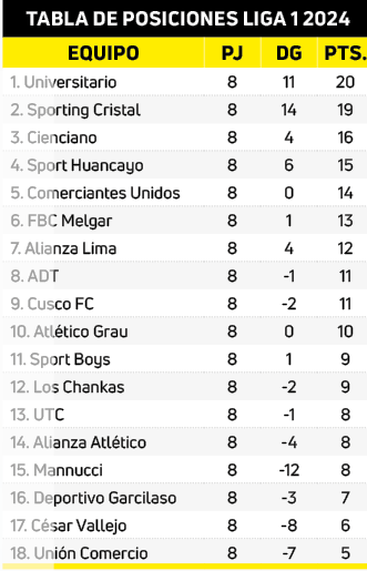 Con este duelo cerró la fecha 8 del Torneo Apertura que inició el martes 12 con el triunfo de Universitario de Deportes por la mínima diferencia ante UTC de Cajamarca. El elenco crema se mantiene a la cabeza de la tabla de posiciones con 20 puntos.