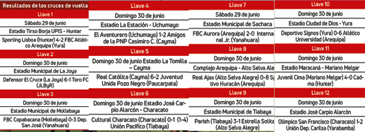 En tal sentido, el cuadro verdolaga aseguró su pasaporte a la tercera ronda, pues en la ida había vencido 2-0.  La lista de doce equipos clasificados a la siguiente fase  se completa con Sporting Lisboa (Hunter), Defensor El Cruce (La Joya), Deportivo San José (Yanahuara), Amigos de la PNP Casimiro Cuadros (Cayma), Real Católica (Cayma), Unión Pacífico (Tiabaya),  FBC Aurora (Arequipa), Parish (Tiabaya), Atlético Universidad (Arequipa), Juvenil Cima (Mariano Melgar) y Unión Deportivo Carilsa (Yarabamba).