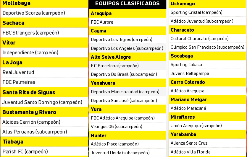 De Arequipa, Cerro Colorado, Mariano Melgar, Miraflores, Paucarpata, Yarabamba, Mollebaya, Socabaya, Sachaca, Vítor, La Joya, saldrán el resto de equipos para la siguiente instancia.