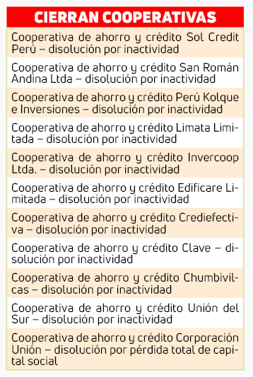 El 15 de setiembre, la Superintendencia de Banca, Seguros y AFP (SBS) informó sobre el cierre de ocho cooperativas de ahorro y crédito y ayer viernes 22 se sumaron otras instituciones financieras más a la lista de disolución y una de ellas es por “pérdida total del capital social y de la reserva cooperativa”.