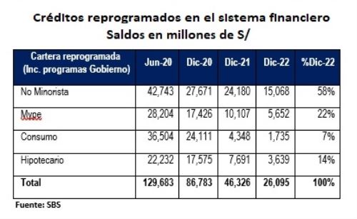 A noviembre del 2022, los préstamos reprogramados de programas del Gobierno llegaron a 13,909 millones de soles, lo que representó un 58.8% del saldo de créditos de programas del Gobierno y 49.9% del saldo de créditos reprogramados, indicó.