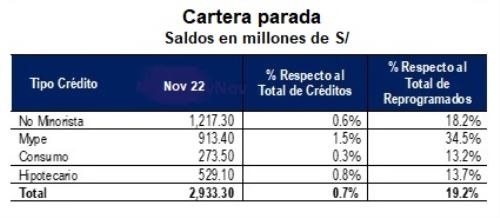 Así, a noviembre del 2022, la cartera parada totalizó 2,933 millones de soles (a marzo 2022 era 4,518 millones de soles), lo que representó el 19.2% de los reprogramados y el 0.69% del total de créditos (en el sistema financiero) a esa fecha, reportó.