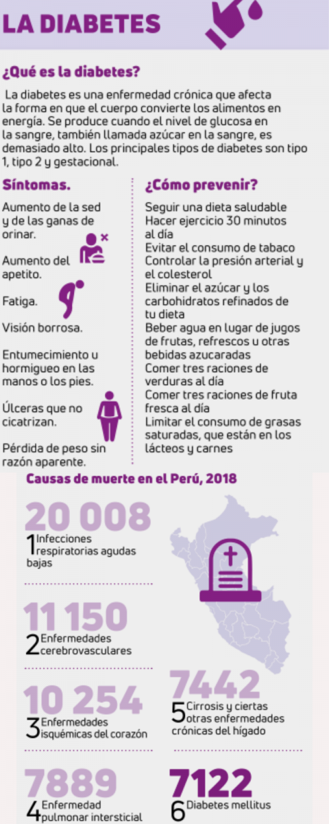 Esta situación plantea interrogantes sobre el acceso a la atención médica en otros distritos, donde los residentes pueden enfrentar dificultades para acceder a los servicios de despistaje de la diabetes. En lugar de realizar campañas específicas o garantizar la disponibilidad de servicios especializados en endocrinología en todas las áreas, los funcionarios de salud parecen limitarse a acciones esporádicas, como la celebración del Día Mundial de la Diabetes cada 14 de noviembre, mediante conferencias y pequeñas campañas de concienciación. Sin embargo, buscamos estadísticas que ofrecen las instituciones públicas del país y lamentablemente la diabetes ocupaba hasta el 2018 la sexta causa de muerte en los peruanos. (Ver infografía)