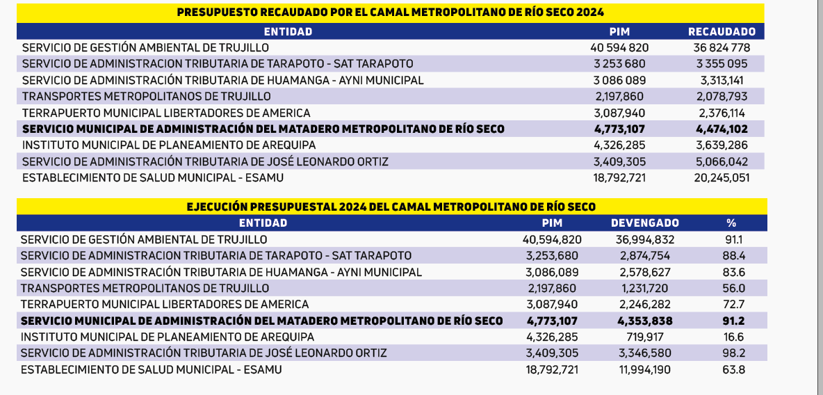 Se sabe que el también conocido camal de Río Seco recibió un presupuesto en el primer trimestre del año pasado de S/4.7 millones y generó un gasto del 91.2 %, la mayoría del dinero en pago de planillas y servicios, hecho que fue cuestionado por diferentes usuarios por la falta de tecnología y equipamiento logístico-industrial en el matadero.