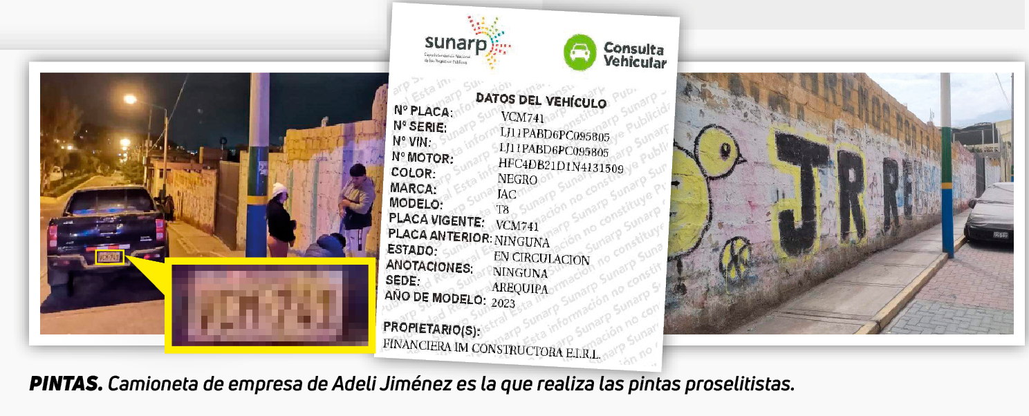 Pero, ¿quien estaría detrás de este pronta campaña política?. Fotografías a la que accedió este medio de comunicación, muestran a personas realizando el pintado, estos llegaron a bordo de  una camioneta de placa VCM 741 que se estacionó en la avenida Berlín (Jacobo Hunter). En consulta con Sunarp, la citada matrícula está registrada a nombre de la empresa en cuestión Financiera Im Constructora.