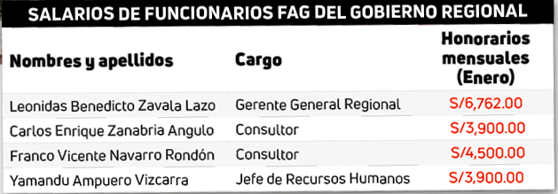 Estos profesionales recibirán “jugosos” sueldos de acuerdo al marco normativo del Decreto Ley n.º 25650. Dentro de la primera lista de convocados por Rohel Sánchez figura su gerente general, Leonidas Zavala Lazo, quien en el primer mes de gestión cobró la suma de S/ 6762.