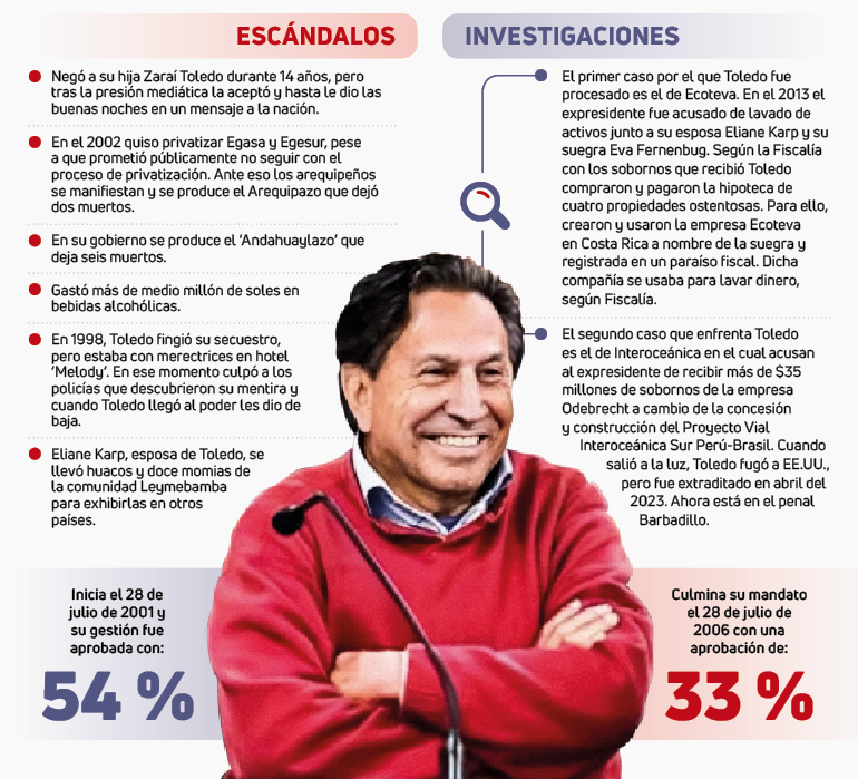 Si bien en su gobierno ya habían indicios de corrupción, fue en el 2013 que enfrenta un proceso por lavado de activos. Luego se suma el de Interoceánica (ver cuadro) y en 2017, Toledo escapó junto a su esposa a Estados Unidos donde protagonizó escándalos ebrio y fue detenido. Ahora está en el Perú donde piden 20 años de prisión por sus más de $35 millones que cobró de sobornos durante su mandato.