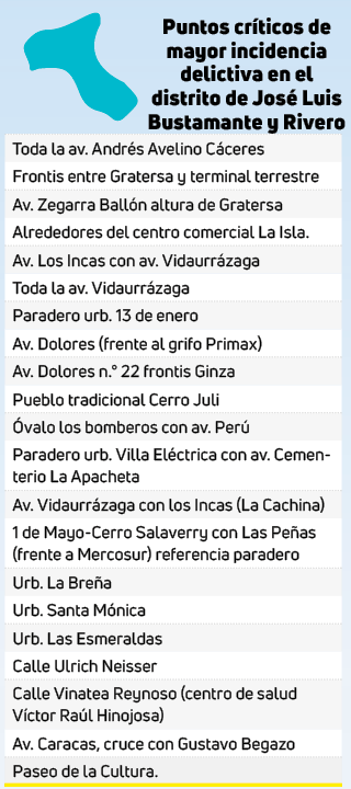 El accionar delincuencial incrementó en la ciudad y en el país, en el caso del distrito de José Luis Bustamante y Rivero los vecinos vieron que este año el municipio y policías comenzaron a hacerle frente a este problema social, pero en los últimos dos años la criminalidad y prostitución han invadido sobre todo la plataforma Andrés Avelino Cáceres de ser solo comercial se convirtió en un nuevo foco de inseguridad ciudadana. Pero, hay 21 puntos críticos donde los facinerosos atemorizan al ciudadano.