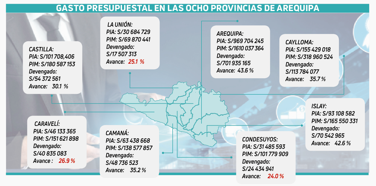 La Municipalidad Provincial de Condesuyos registra la cifra más carente, ya que de recibir S/101.7 millones en marzo del presente año, a la fecha solo devengó S/24.4 millones y presenta un avance del 24 %. Situación similar hay en el municipio de La Unión con un gasto del 25. 1 % de sus S/69.8 millones recibidos.