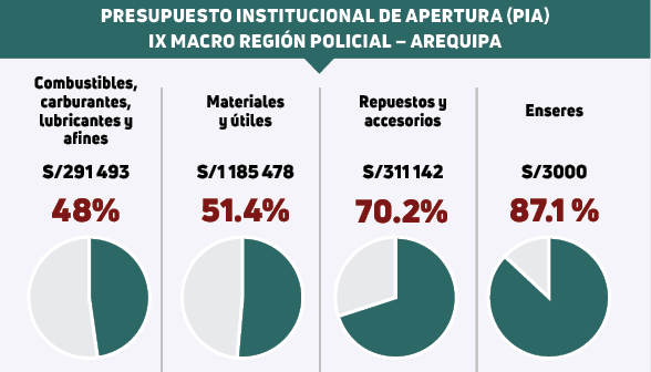 En el portal de transparencia del Ministerio de Economía y Finanzas, la IX Macro Región Policial Arequipa, hasta 26 de agosto, en combustibles, carburantes, lubricantes y afines para toda la región de Arequipa, tuvo un avance del 48 % en gasto del presupuesto de apertura de S/ 291 mil. Igualmente se tuvo avance de 51.4 % en gasto de materiales y útiles, cuyo presupuesto es de S/1 185 478 y en repuestos y accesorios, un avance del S/70.2% con monto inicial de S/311 142.
