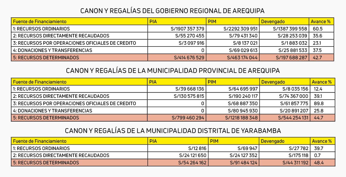 Señaló que el estimado porcentual de avance del Presupuesto Institucional Modificado (PIM) a estas alturas del año, debería ser del 60 %. No obstante, entidades como: Gobierno Regional de Arequipa (42.7 %), Municipalidad Provincial de Arequipa (44.7 %) y Municipio Distrital de Yarabamba (48.4 %) se encuentran por debajo de lo proyectado, así lo confirmó el portal Consulta Amigable del MEF.