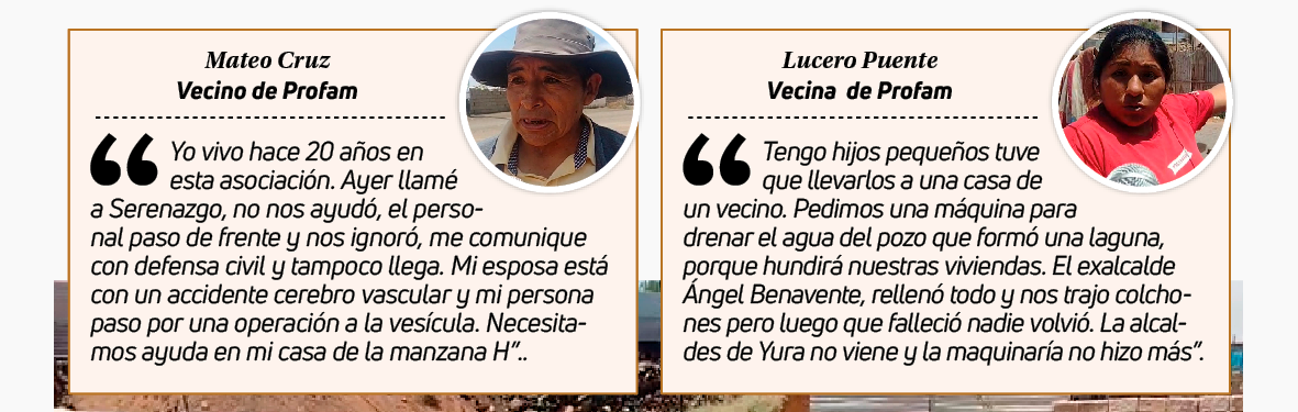 Vecinos de la asociación Profam sector II del distrito de Yura viven atemorizados, luego que el jueves 22 de febrero un huaico arrasará con sus viviendas. El agua  y lodo inundaron las casas llegando a un metro de altura cubriendo las paredes, formando una laguna en las zonas bajas de los terrenos en el sector II y manzana H, I y G.