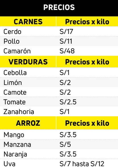 El tomate a S/2.5 el kilo, limón a S/2 el kilo.El precio de la papa ‘canchán’ 5 kilos a S/6.5, ‘mariva’ 5 kilos a S/6.5, papa rosada única cinco  kilos por S/5 y la papa ‘yema’  dos kilos por S/5.