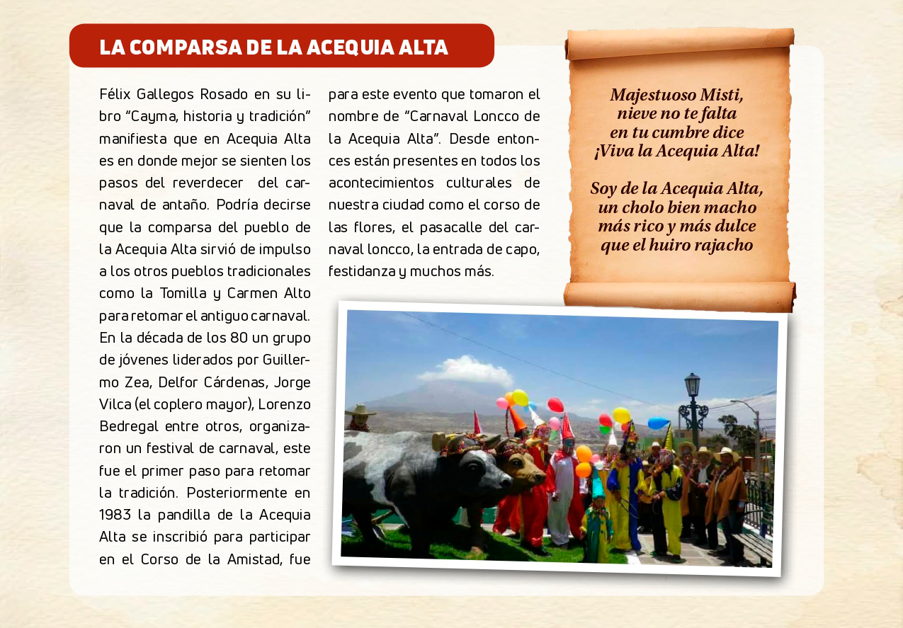 Una de las estampas folklóricas más alegres y pintorescas de nuestra tierra, son las fiestas del carnaval. El carnaval es una antigua festividad europea, traída al Perú por los conquistadores, se deduce que esta celebración se llevó a cabo en Arequipa, por primera vez el año de 1541.