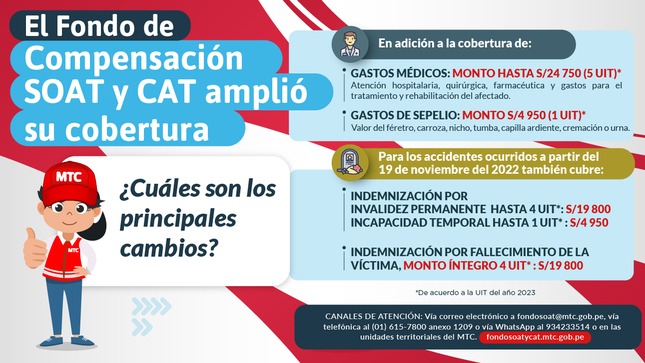 El Fondo de Compensación del SOAT (Seguro Obligatorio de Accidentes de Tránsito) y del CAT (Certificado contra Accidentes de Tránsito) del Ministerio de Transportes tiene reembolsos  que llegan hasta los S/24 750 (5 UIT) por persona para cubrir los gastos de atención hospitalaria, quirúrgica, farmacéutica y otros que sean necesarios para el tratamiento y rehabilitación de la víctima. Ello se realiza mediante la devolución al beneficiario o directamente al centro de salud que atendió al accidentado.