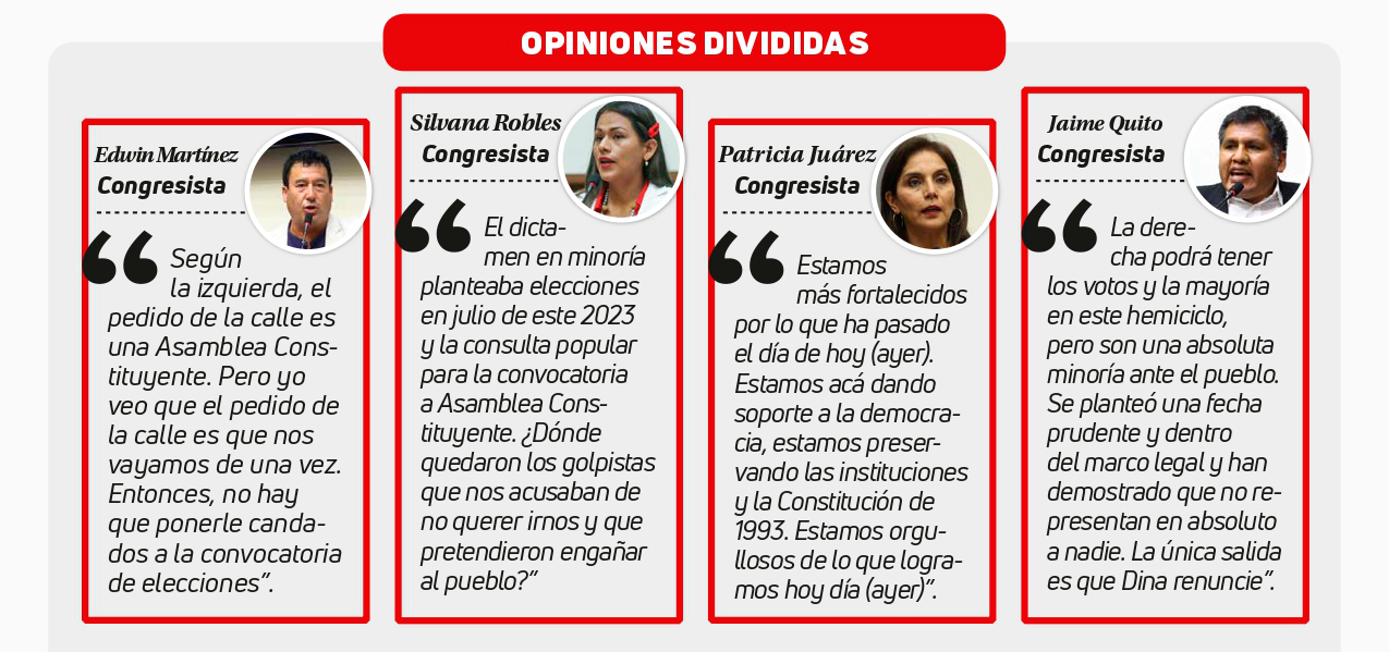 EXCUSAS. Los legisladores de Fuerza Popular indicaron que votaron en contra porque no aceptarán una Asamblea Constituyente; sin embargo, tuvieron la oportunidad de votar en contra solo de ello y no lo hicieron. Mientras tanto, bancadas como Renovación Popular aseguraron que un adelanto de comicios no era la solución a la crisis.