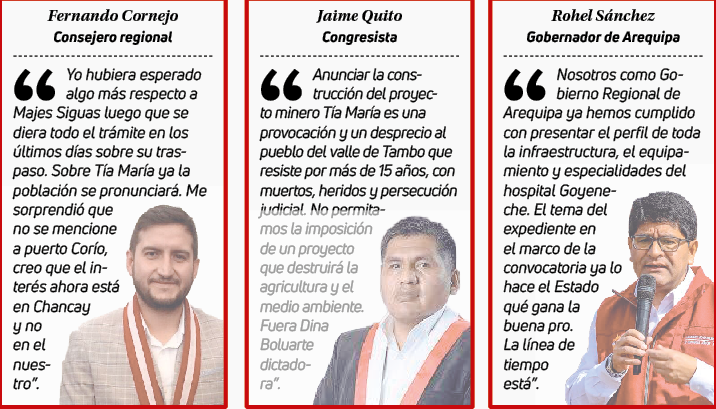 Sobre el coyuntural y polémico proyecto minero Tía María de la empresa Southern Perú a ejecutarse en la provincia de Islay, la presidenta, Dina Boluarte, indicó que esta iniciativa ya es una realidad y tiene beneficios para Arequipa pese a las protestas y rechazo de la población.