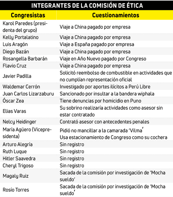 Los encargados de investigar y sancionar a los malos parlamentarios son los miembros de la Comisión de Ética, pero hasta la fecha solo hay respuestas suaves y blindaje. Esto se debería porque 13 de los 17 legisladores, de dicho grupo, también tienen cuestionamientos. En un cuadro elaborado por el periodista Martín Hidalgo da cuenta que solo cuatro de los congresistas están ‘limpios’.