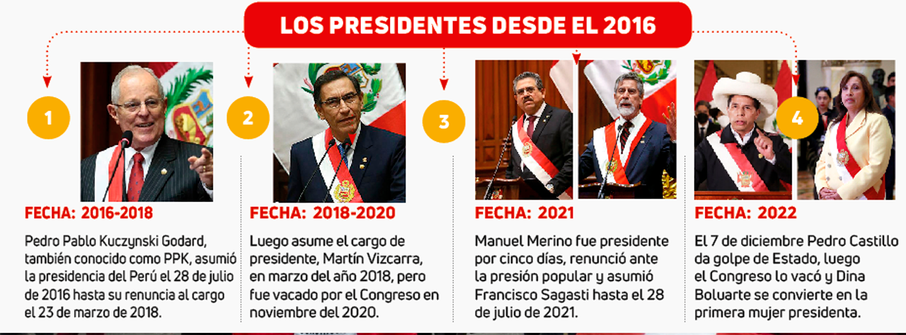 HISTÓRICO. Dina Boluarte ahora es la primera mujer en ser presidenta del Perú, juramentó al cargo este 7 de diciembre a las 15:00 horas. Con ella, el Perú tiene en solo siete años, la misma cantidad de presidentes, lo que refleja una inestabilidad política. (Ver línea de tiempo). La mandatariamarca un hito histórico en medio de una crisis política que sigue destruyendo al país.