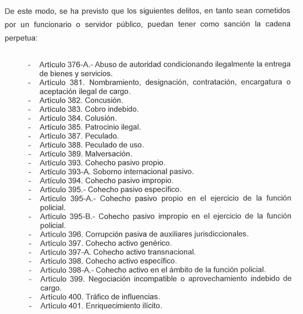 La propuesta modifica el Código Penal e incluye delitos específicos, que los considera como los ‘más graves’ en contra de la administración pública. También detalla que para ser condenados de por vida, el juez deberá considerar la gravedad del caso, perjuicio patrimonial al Estado y/o afectación a la correcta administración pública.