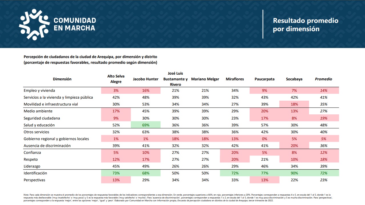 El estudio analiza la opinión de los pobladores de dichos distritos respecto a 14 dimensiones: empleo y vivienda,  servicios a la vivienda y limpieza pública, movilidad e infraestructura vial, medio ambiente, seguridad, salud y educación, otros servicios, gobierno regional y gobiernos locales, ausencia de discriminación, confianza, respeto, liderazgo, identificación con Arequipa y perspectivas.