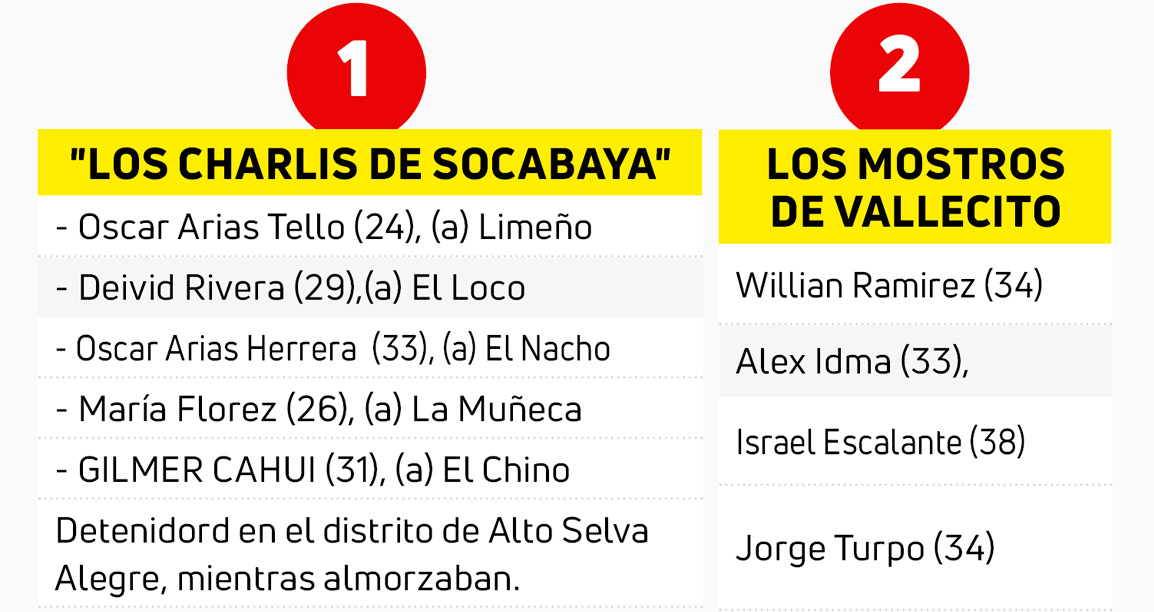 Se acercaban a las ventanas del transporte público y autos para arrebatar los teléfonos celulares de sus víctimas. “Los mostros del Vallecito” fueron detenidos por la Policía Nacional del Perú, cuando se disponían a delinquir en la avenida Parra frente a un supermercado. Sin embargo, huyeron para luego quedar detenidos en la misma avenida.