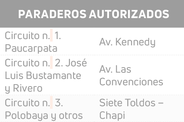 Hay tres paraderos habilitados por el Municipio Provincial de Arequipa y resguardados por inspectores de transporte. (Ver cuadro)El personal revisa que los choferes cumplan con llevar el SOAT de su vehículo y requisitos como revisión técnica para emprender el viaje de alrededor 2 horas.
